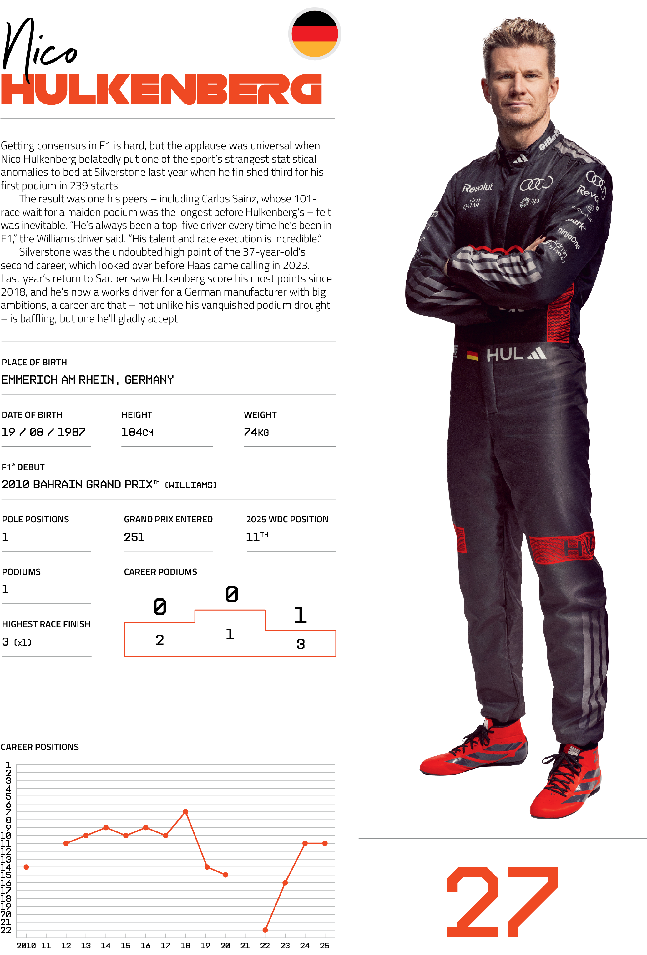 Getting consensus in F1 is hard, but the applause was universal when Nico Hulkenberg belatedly put one of the sport’s strangest statistical anomalies to bed at Silverstone last year when he finished third for his first podium in 239 starts.
