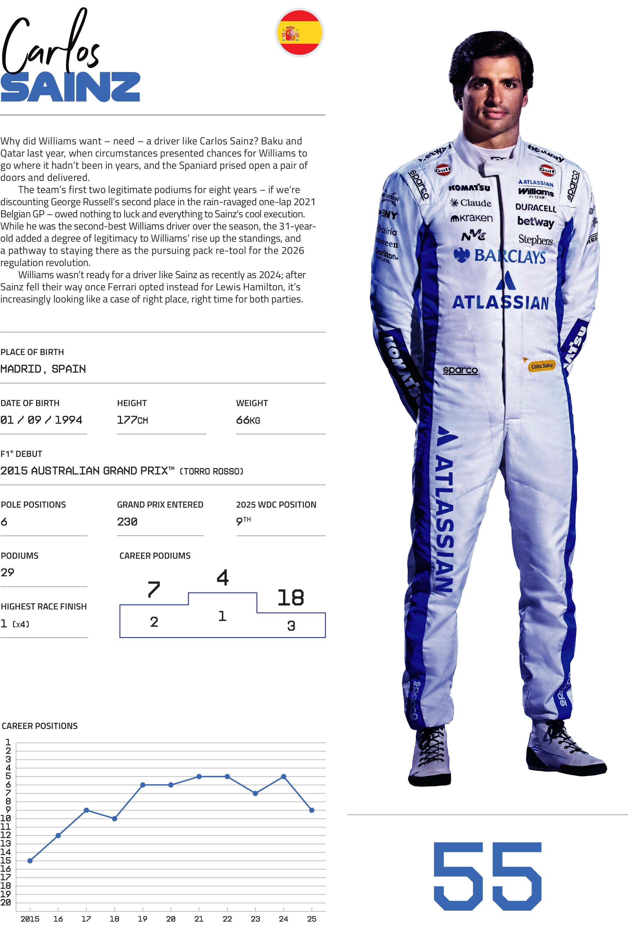 The team’s first two legitimate podiums for eight years – if we’re discounting George Russell’s second place in the rain-ravaged one-lap 2021 Belgian GP – owed nothing to luck and everything to Sainz’s cool execution. While he was the second-best Williams driver over the season, the 31-year- old added a degree of legitimacy to Williams’ rise up the standings, and a pathway to staying there as the pursuing pack re-tool for the 2026 regulation revolution.