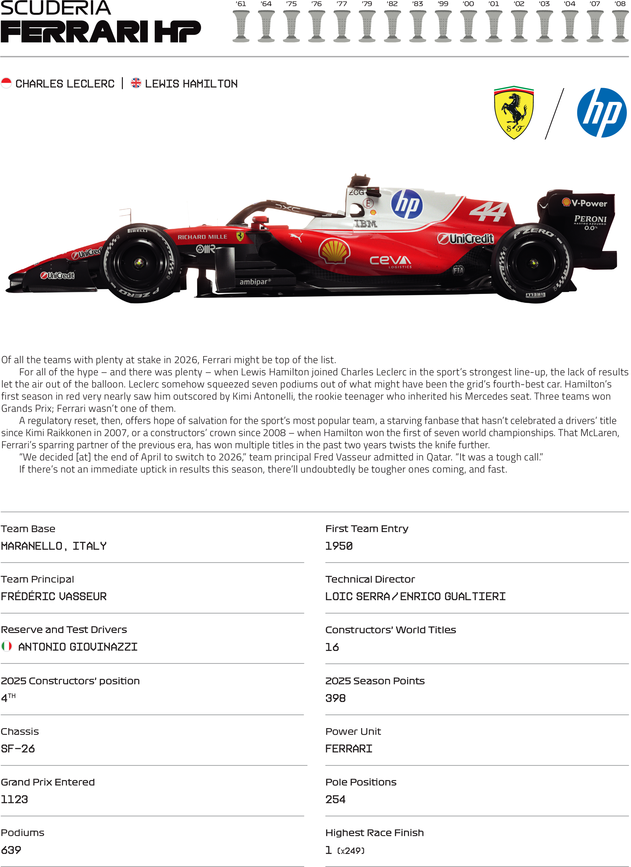 For all of the hype – and there was plenty – when Lewis Hamilton joined Charles Leclerc in the sport’s strongest line-up, the lack of results let the air out of the balloon. Leclerc somehow squeezed seven podiums out of what might have been the grid’s fourth-best car. Hamilton’s first season in red very nearly saw him outscored by Kimi Antonelli, the rookie teenager who inherited his Mercedes seat. Three teams won Grands Prix; Ferrari wasn’t one of them.
