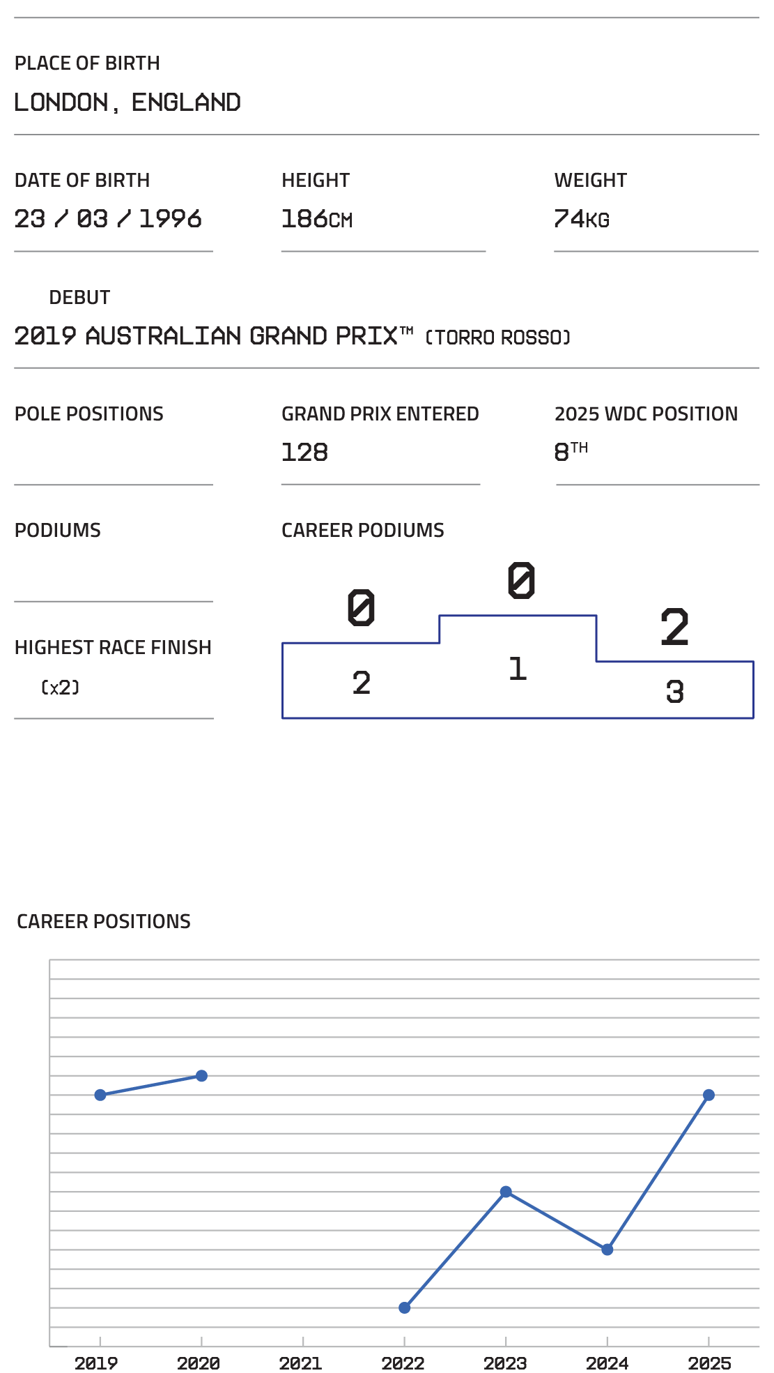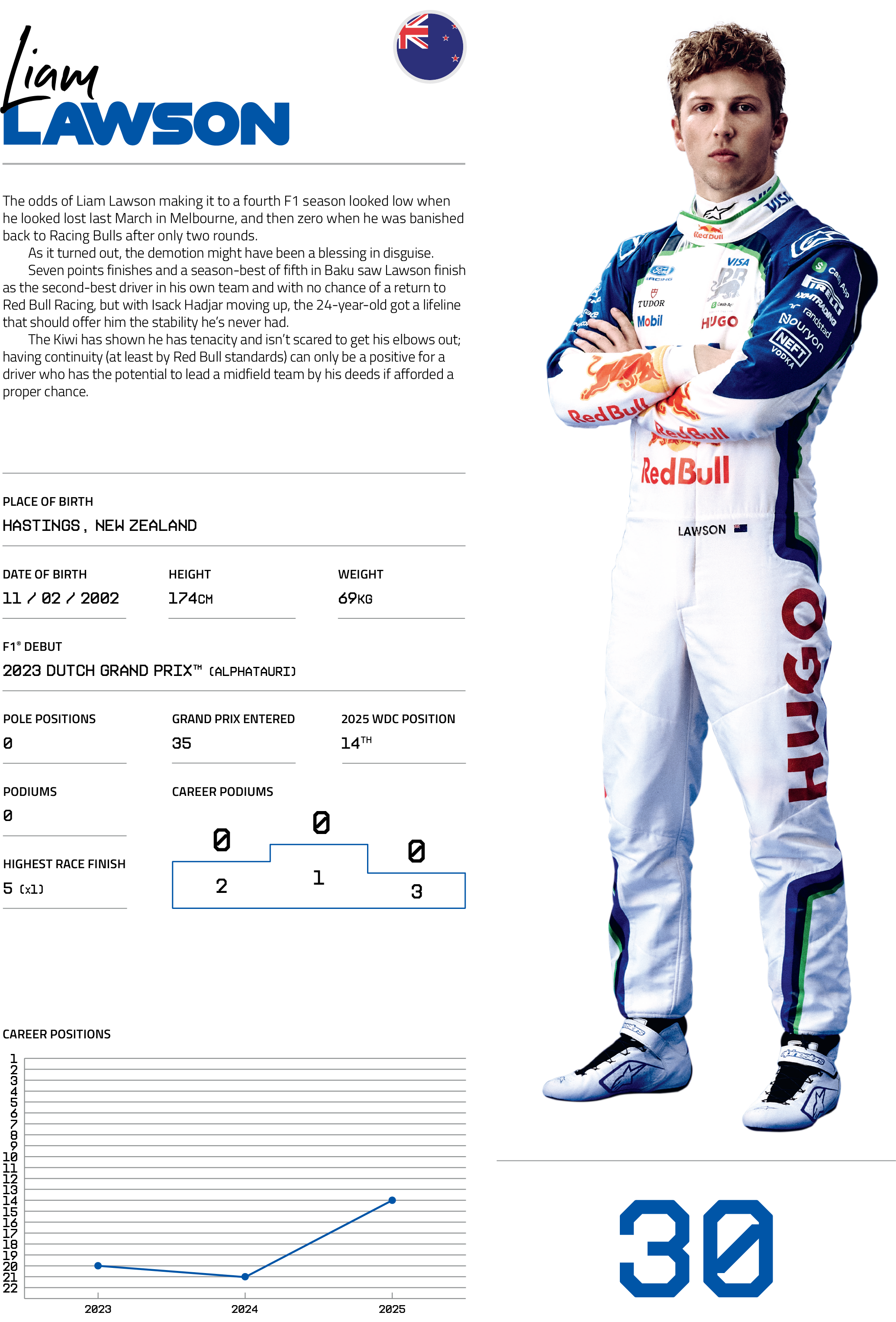 Seven points finishes and a season-best of fifth in Baku saw Lawson finish as the second-best driver in his own team and with no chance of a return to Red Bull Racing, but with Isack Hadjar moving up, the 24-year-old got a lifeline that should offer him the stability he’s never had.
