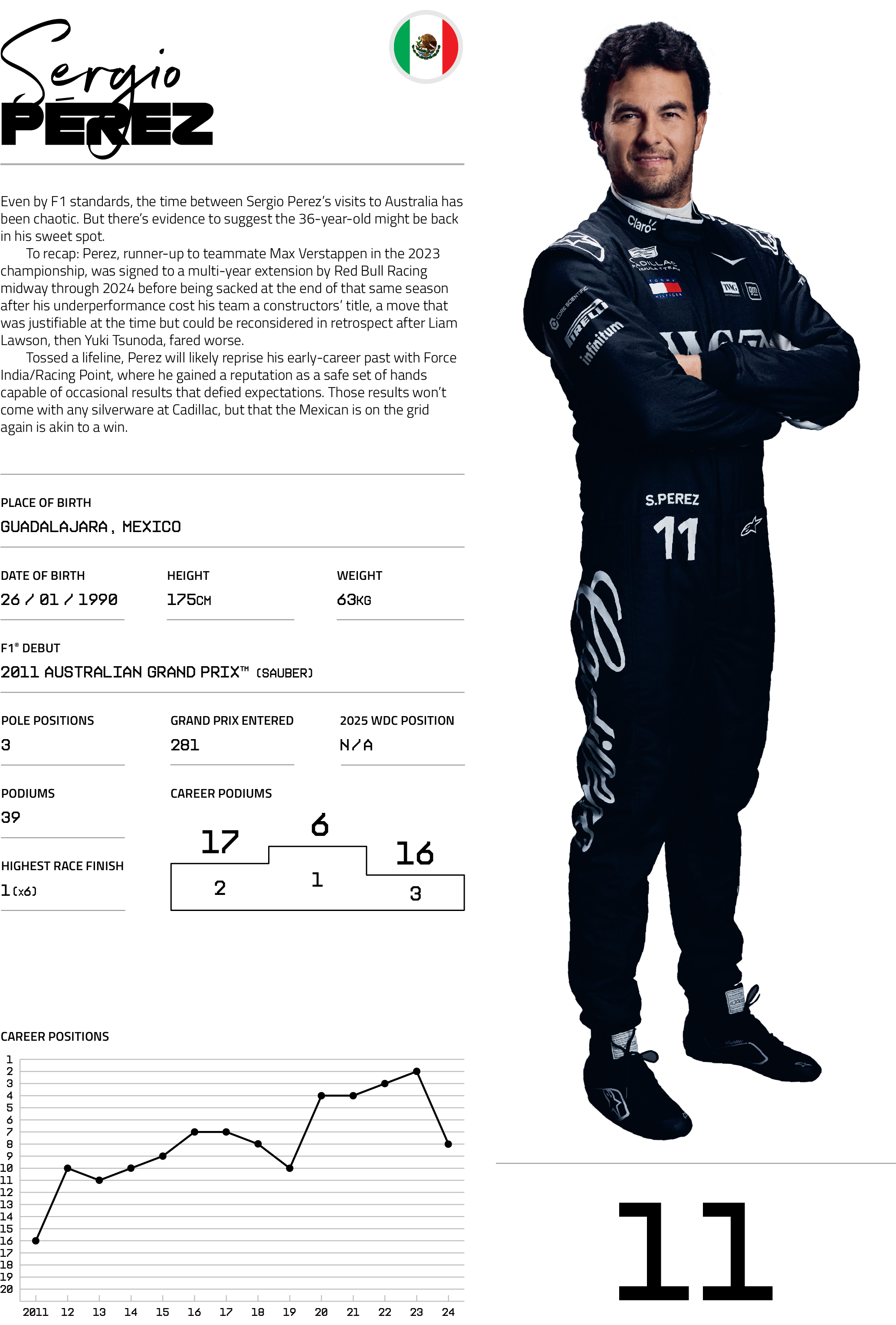Tossed a lifeline, Perez will likely reprise his early-career past with Force India/Racing Point, where he gained a reputation as a safe set of hands capable of occasional results that defied expectations. Those results won’t come with any silverware at Cadillac, but that the Mexican is on the grid again is akin to a win.