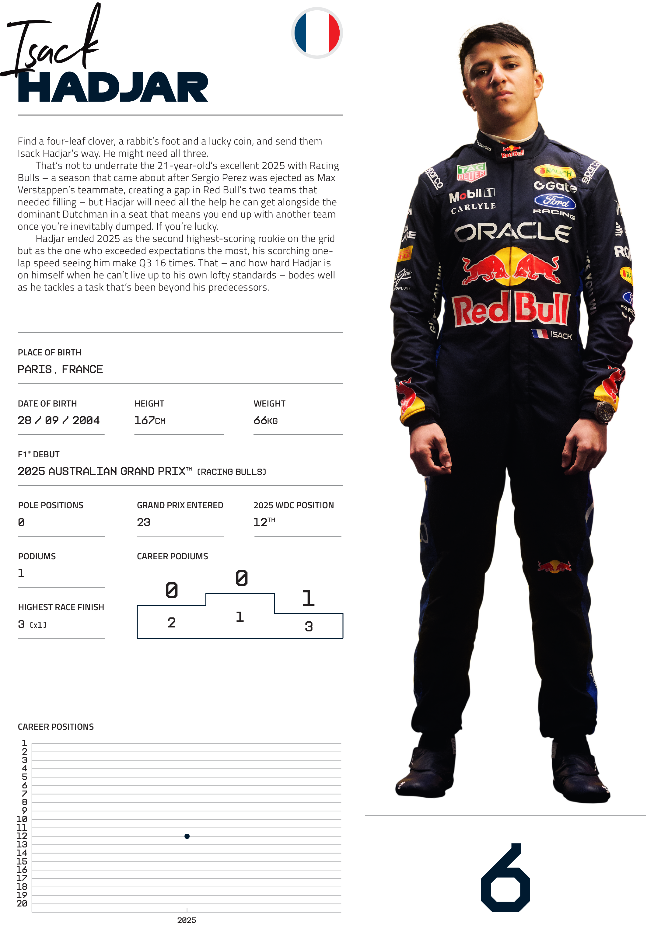 Hadjar ended 2025 as the second highest-scoring rookie on the grid but as the one who exceeded expectations the most, his scorching one- lap speed seeing him make Q3 16 times. That – and how hard Hadjar is on himself when he can’t live up to his own lofty standards – bodes well as he tackles a task that’s been beyond his predecessors