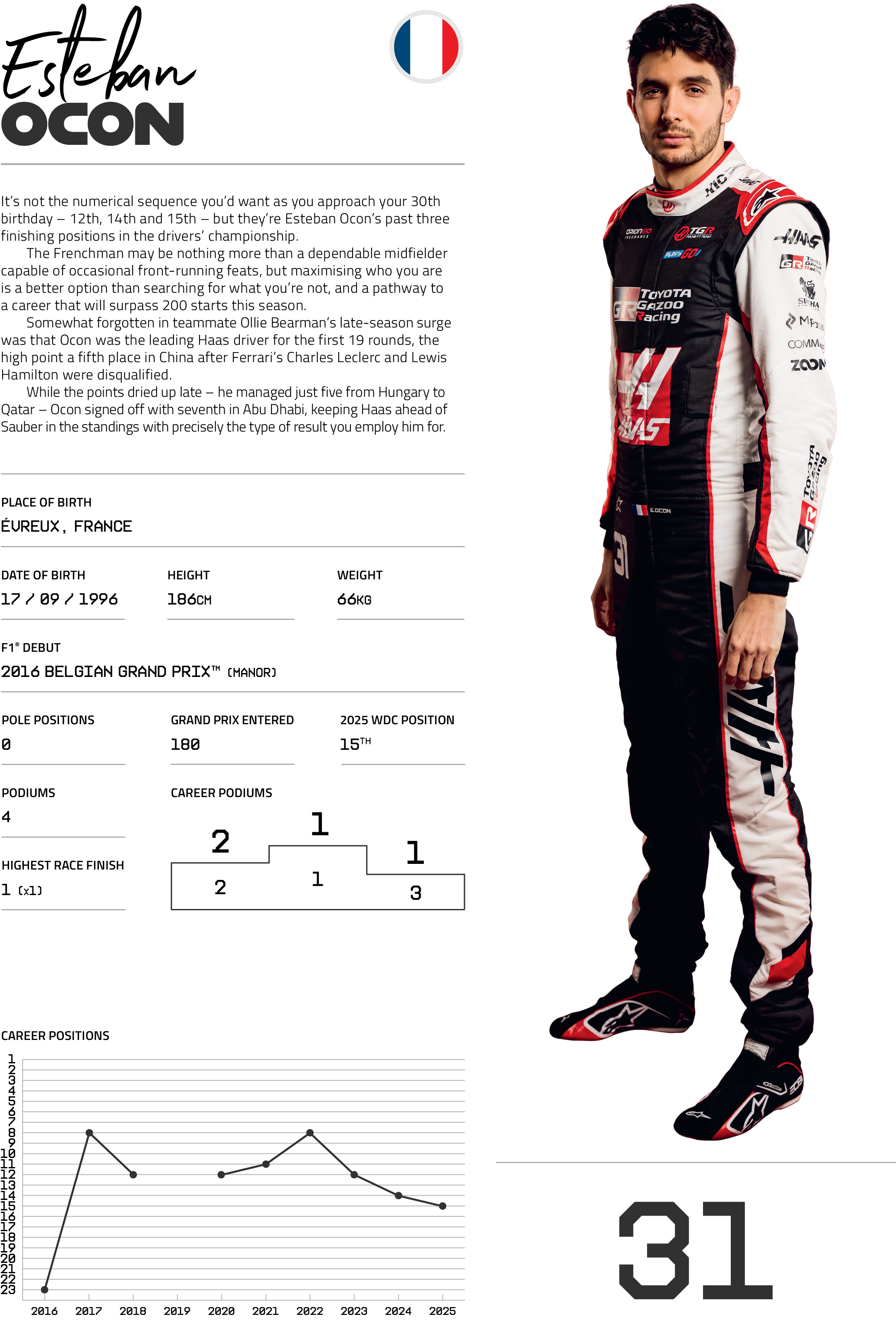 Somewhat forgotten in teammate Ollie Bearman’s late-season surge was that Ocon was the leading Haas driver for the first 19 rounds, the high point a fifth place in China after Ferrari’s Charles Leclerc and Lewis Hamilton were disqualified.