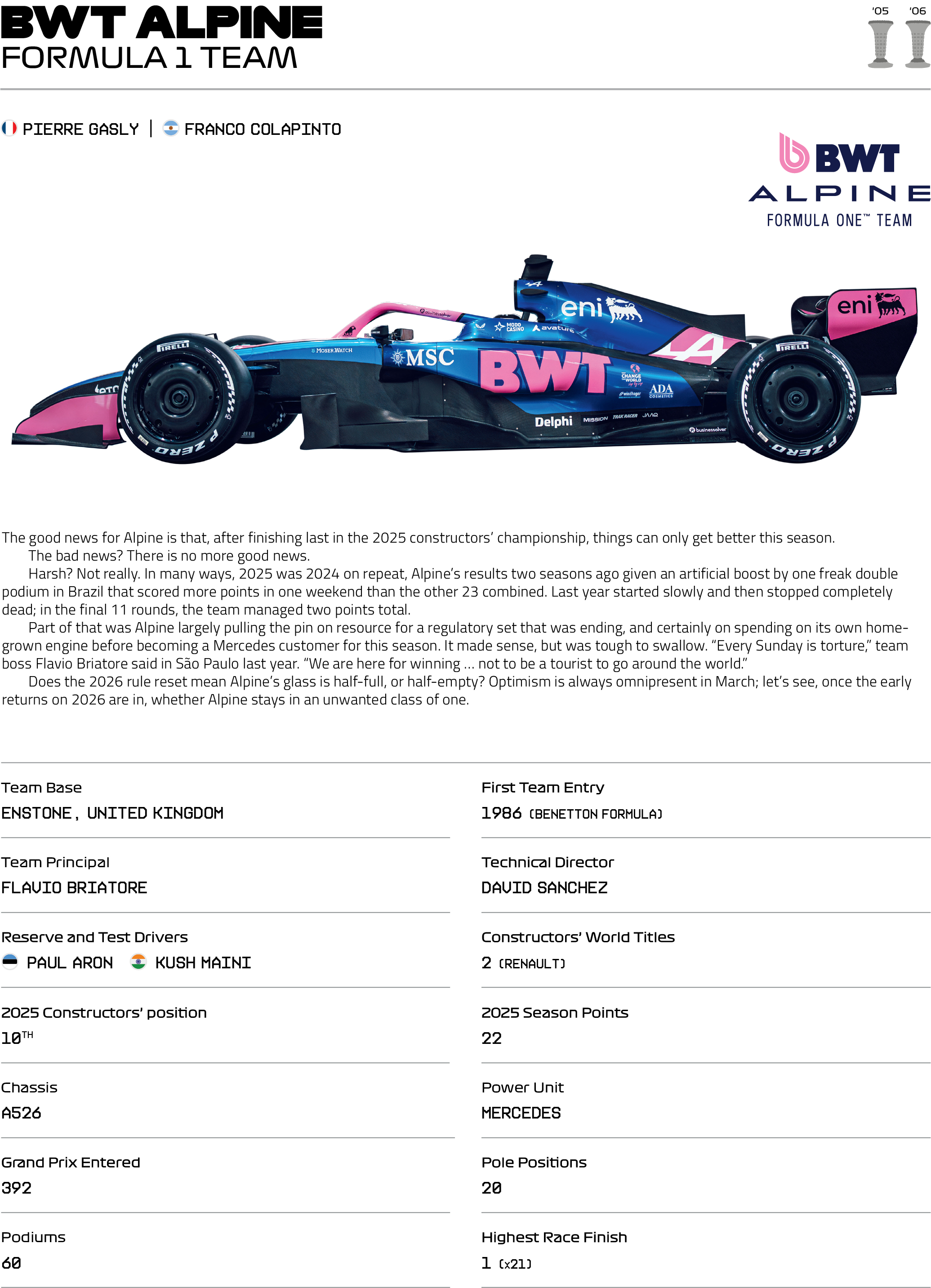 Part of that was Alpine largely pulling the pin on resource for a regulatory set that was ending, and certainly on spending on its own home-grown engine before becoming a Mercedes customer for this season. It made sense, but was tough to swallow. “Every Sunday is torture,” team boss Flavio Briatore said in São Paulo last year. “We are here for winning … not to be a tourist to go around the world.” Does the 2026 rule reset mean Alpine’s glass is half-full, or half-empty? Optimism is always omnipresent in March; let’s see, once the early returns on 2026 are in, whether Alpine stays in an unwanted class of one.