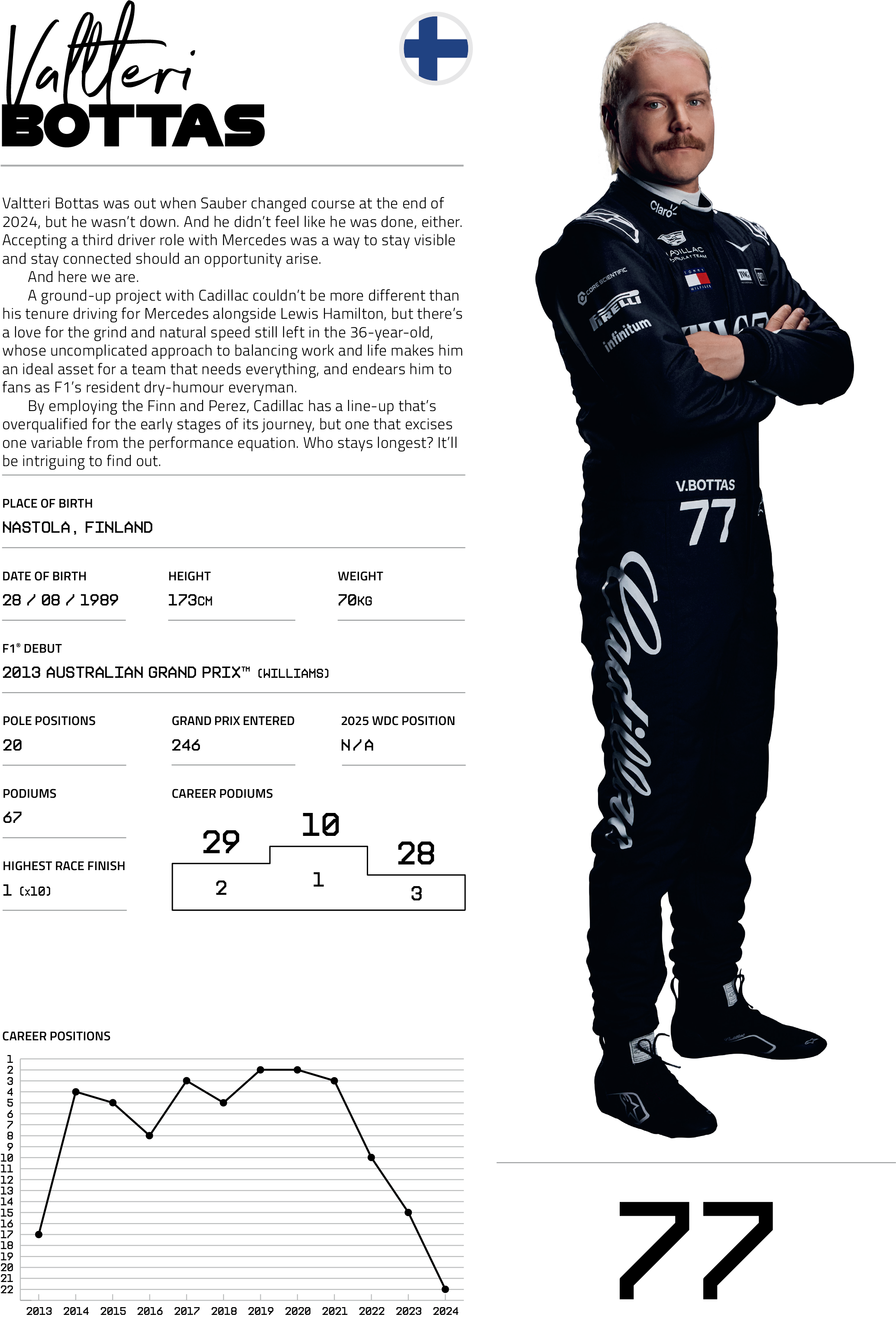 A ground-up project with Cadillac couldn’t be more different than his tenure driving for Mercedes alongside Lewis Hamilton, but there’s a love for the grind and natural speed still left in the 36-year-old, whose uncomplicated approach to balancing work and life makes him an ideal asset for a team that needs everything, and endears him to fans as F1’s resident dry-humour everyman.