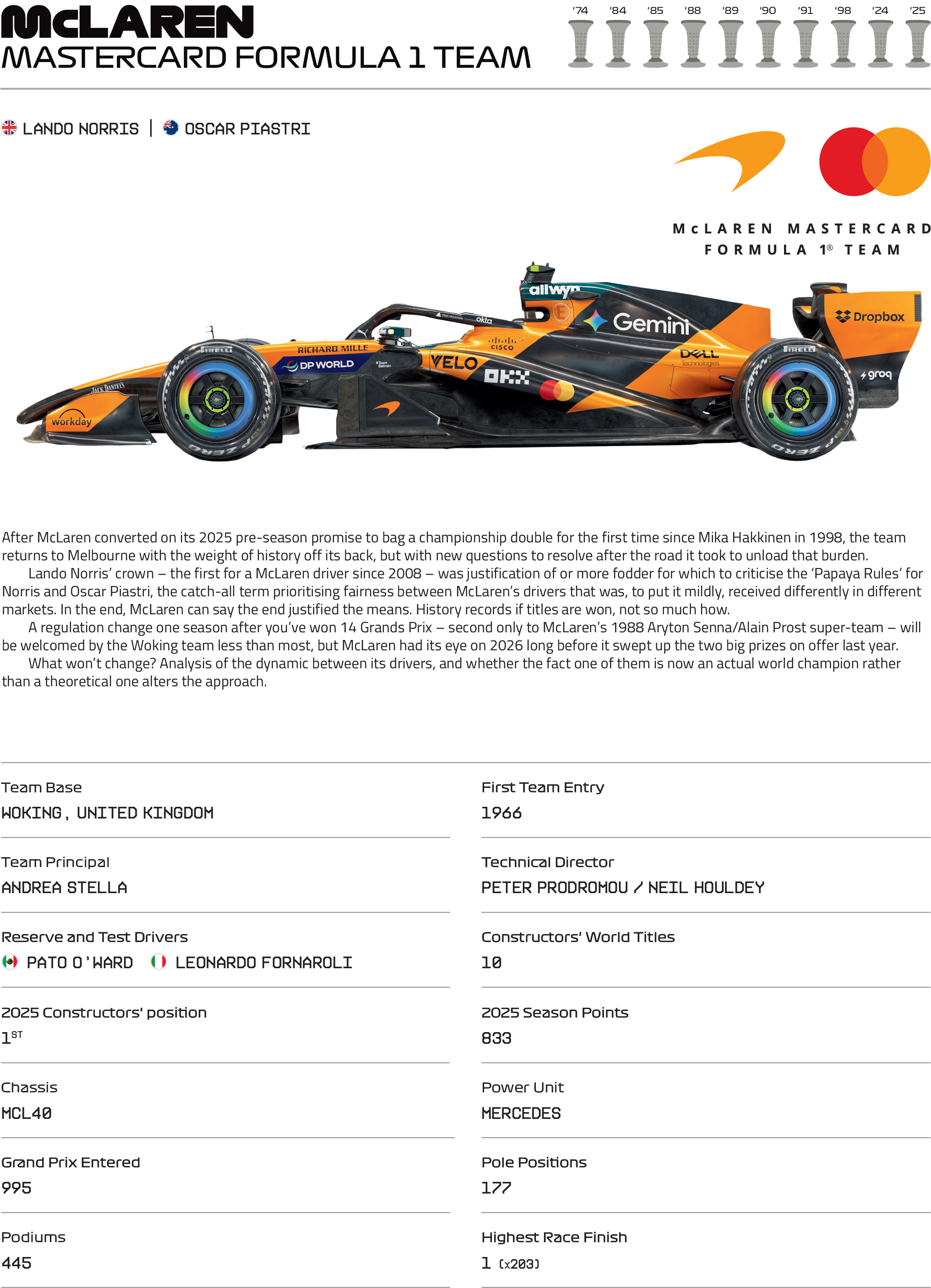 After McLaren converted on its 2025 pre-season promise to bag a championship double for the first time since Mika Hakkinen in 1998, the team returns to Melbourne with the weight of history off its back, but with new questions to resolve after the road it took to unload that burden.