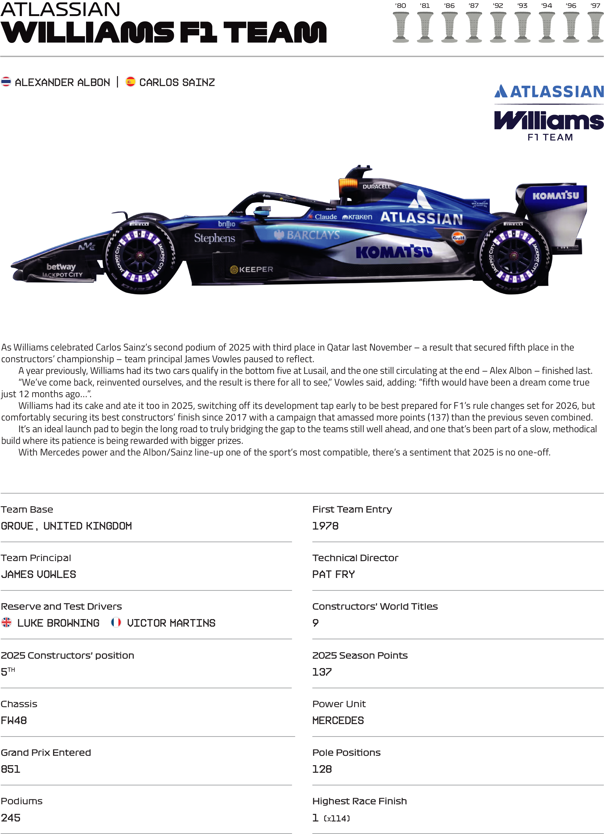 Williams had its cake and ate it too in 2025, switching off its development tap early to be best prepared for F1’s rule changes set for 2026, but comfortably securing its best constructors’ finish since 2017 with a campaign that amassed more points (137) than the previous seven combined.